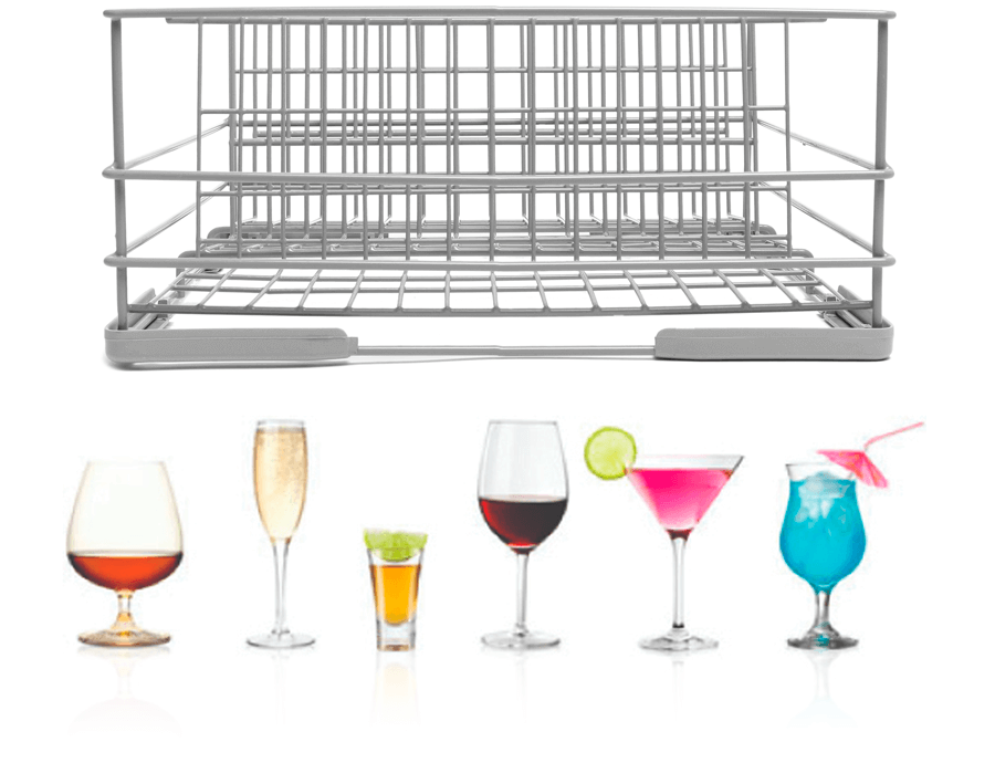 The Divided Glass Basket is suitable for specialist style glasses that measure up to 150mm in height, such as Shot Glasses, Cocktail Glasses, Champagne Glasses and Wine Glasses.